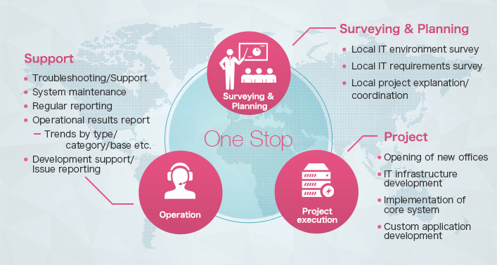 Bi-lingual staff, who are well-versed in business and IT affairs in both Japan and Europe, can assist with your growth into overseas markets and with initiatives to improve IT at overseas bases.