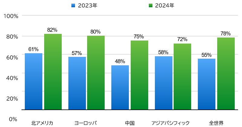 20世紀後半、インターネットが第三次産業革命をもたらしたと言われるが、そのわずか数10年後の現代は、AIによる第四次産業革命が始まったとも言われている。企業はますますAIファーストの運用モデルを採用し、単純な自動化にとどまらず、中核的な意思決定やワークフローに AIを組み込んでいる。マッキンゼーによると、2026年初頭の時点でアメリカ合衆国の企業の88%が少なくとも1つの業務機能でAIを活用していると言われている。また、主な地域別に見ると、2023年および2024年の世界の企業におけるAIの導入率を表した以下のグラフにあるとおり、アメリカでの利用度が一番高く、次いでヨーロッパとなっているが、アジアパシフィックでの利用はまだ若干低い。